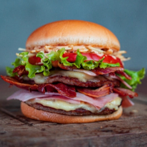 Pão, hambúrguer de frango, mussarela, presunto, ovo, bacon, batata e salada