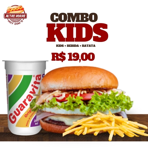 1 Hambúrguer kids ou hot dog kids + 1 batata P + 1 guaravita