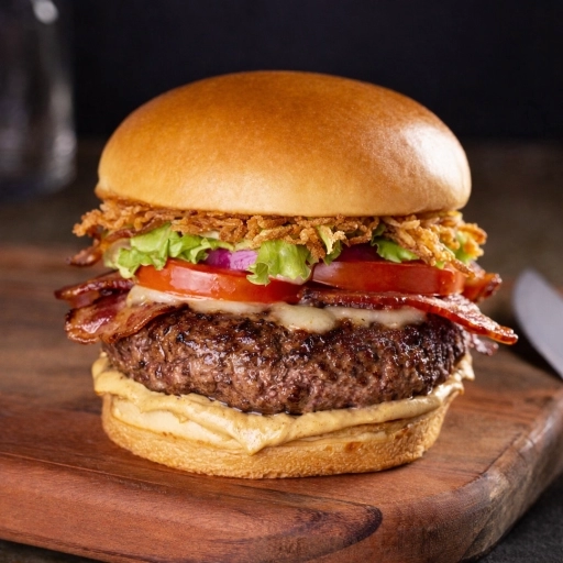 Pão, carne artesanal 160g, mussarela, cream cheese, bacon, cebola crispy e salada