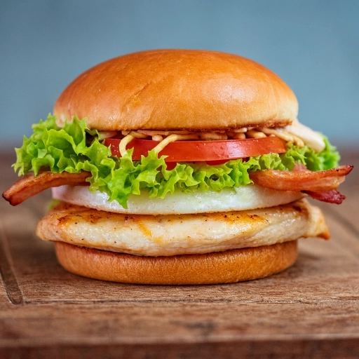 Pão, hambúrguer de frango, mussarela, bacon, ovo, batata e salada