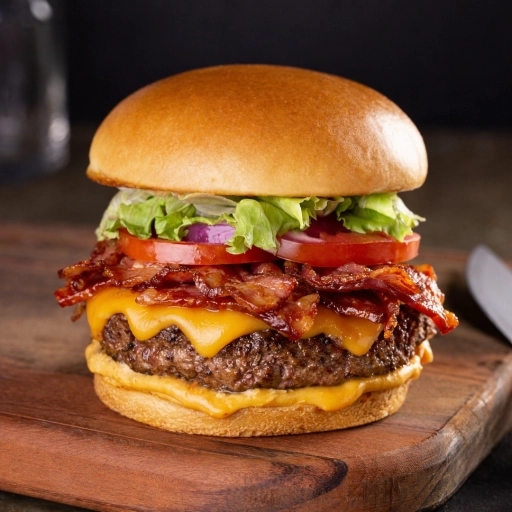 Pão, carne artesanal 160g, mussarela, cheddar, bacon, cebola crispy e salada
